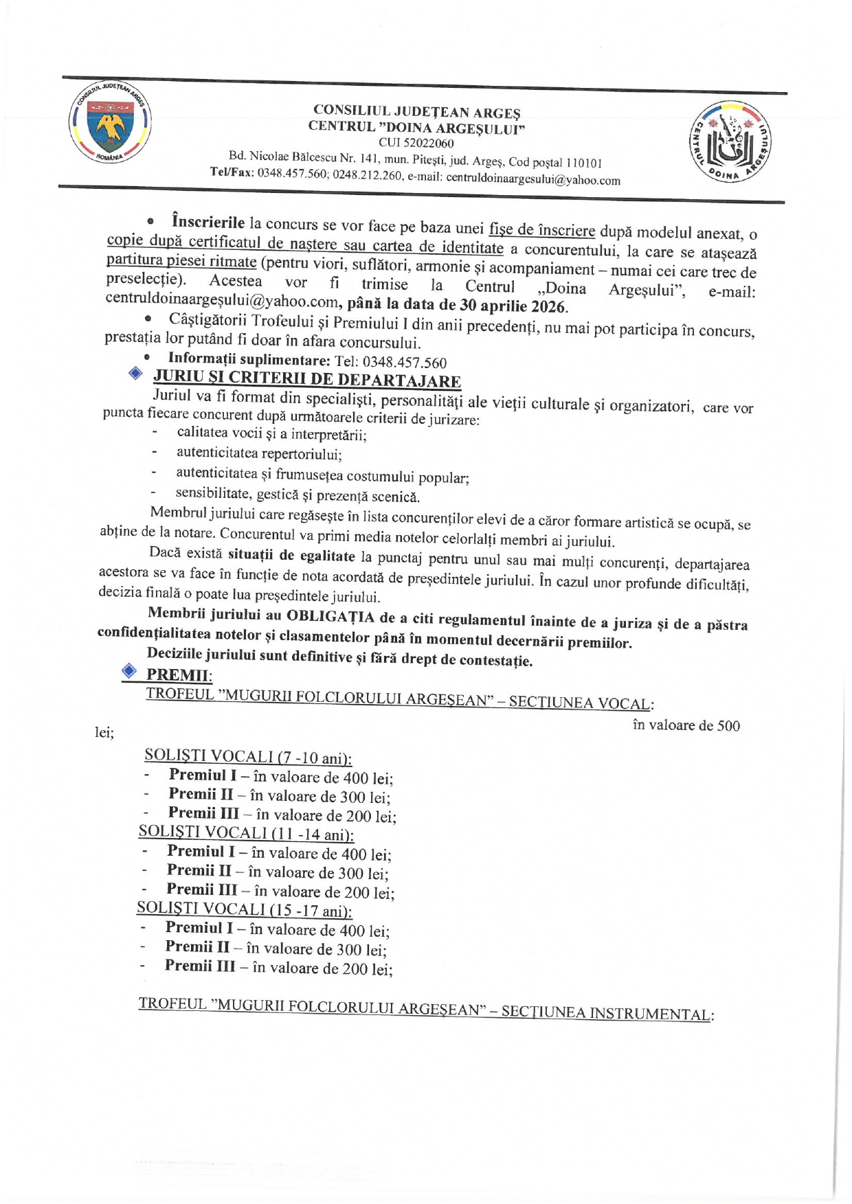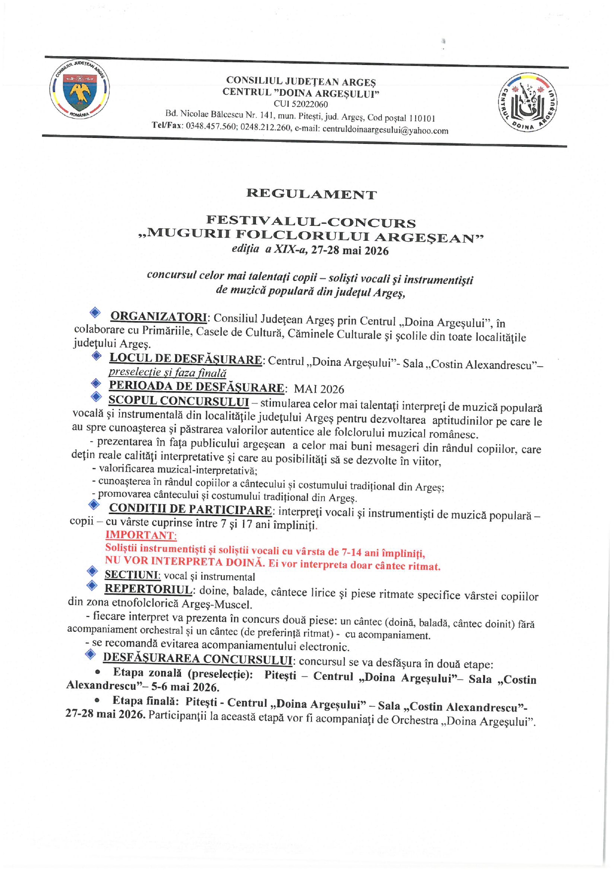 Dragi iubitori ai folclorului românesc, vă anunțăm că regulamentul oficial al concursului „Mugurii Folclorului Argeșean” poate fi consultat începând de astăzi.
