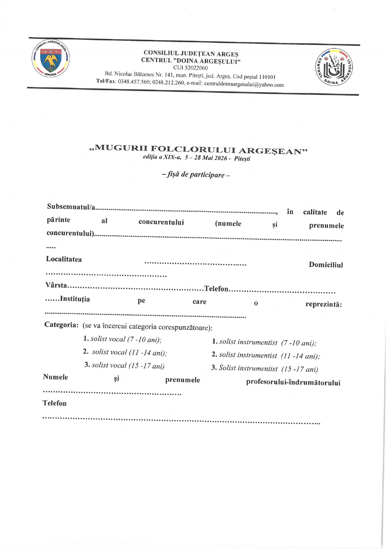 Concursul: 27-28 mai 2026, Sala „Costin Alexandrescu”